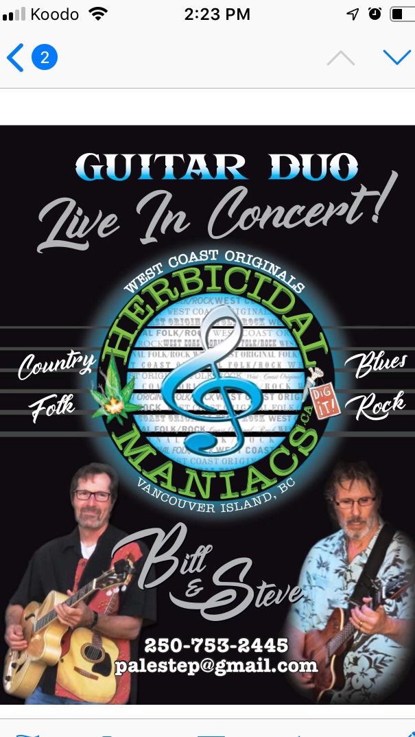 Come join us for our first time performance of The Herbicidal Maniacs!This duo plays a blend of Country,Rock and Blues Music.They have a long history on the Island.For local shuttle pickup after 9pm call 2502081191! For dinner reservations call 2506565042!NO COVER CHARGE!