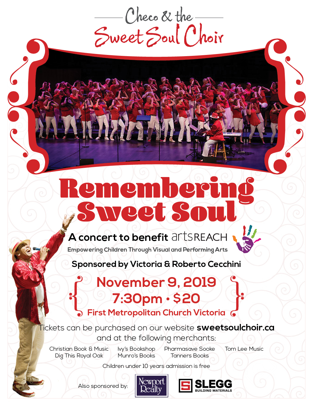 Checo & the Sweet Soul Choir entertains the audience with a concert of finger snapping, hand clapping, hip swaying Motown & Soul music. All to benefit ArtsReach, a fantastic local non-profit. Additionally, The Poppy Fund will be present taking donations and offering poppies to proudly wear whilst you’re, ‘REMEMBERING SWEET SOUL’ and throughout the Remembrance Day Weekend. It’ll be great to see you there. Visit www.sweetsoulchoir.ca for tickets and outlets. Children under 10yrs free