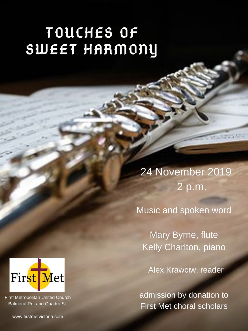Round out your fall with this special, one-hour concert of contemplation blending music and spoken word, featuring Mary Byrne (flute), Kelly Charlton (piano) and Alec Kracwic (speaker). Admission by donation to the First Metropolitan Music Bursary Fund