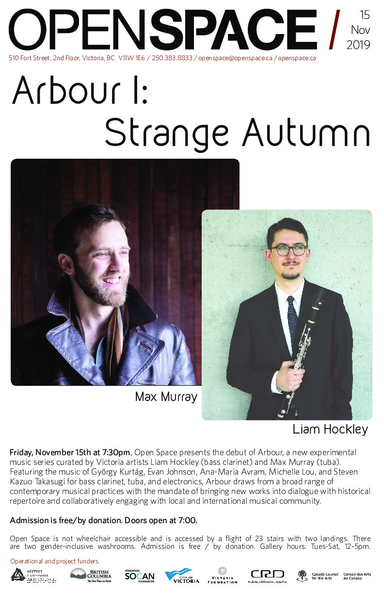 Friday, November 15, at 7:30pm, Open Space will host the debut of Arbour, a new experimental music series curated by Victoria artists Liam Hockley (bass clarinet) and Max Murray (tuba). Admission is free/by donation.