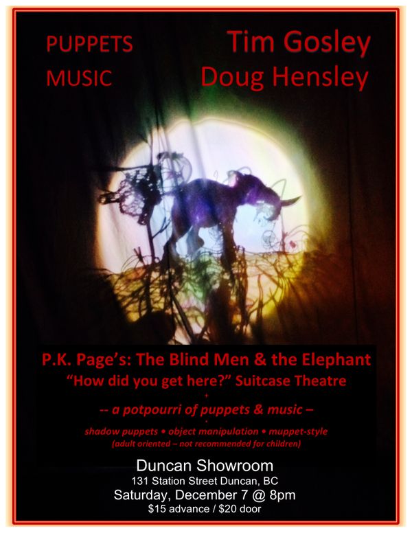 P.KPages:The Blind Men and the Elephant "How did you get here?" Suitcase Theatre: Tim Gosely  (Puppets), Doug Hensley (Music) @ Duncan Showroom Dec 7 2019 - Dec 25th @ Duncan Showroom