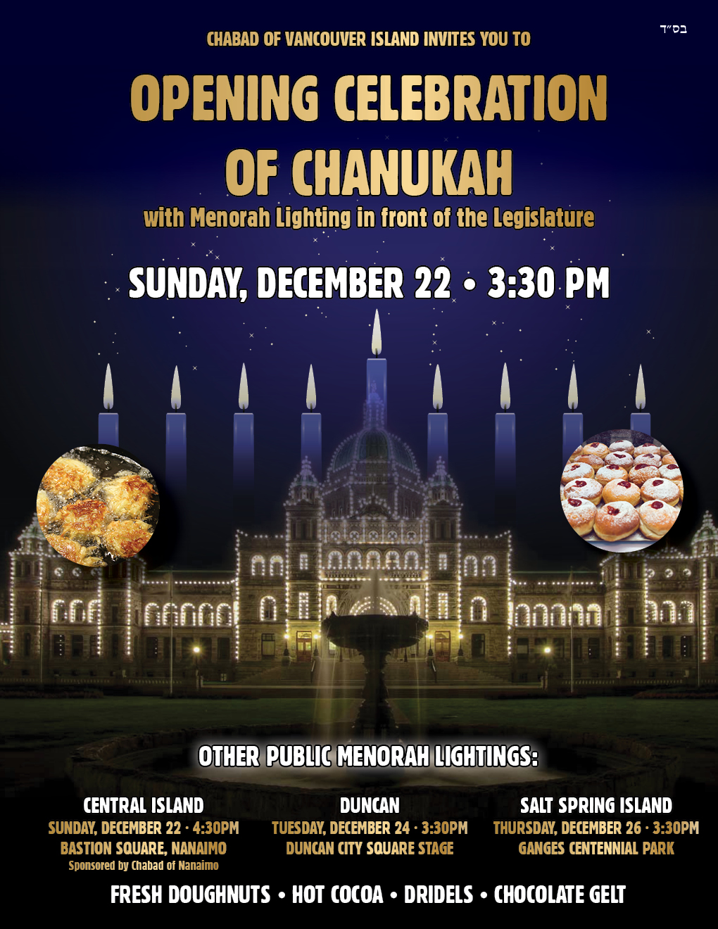 The entire community is invited to join and celebrate the 3rd night of Chanukah with the lighting of an 8-foot tall public menorah. Everyone is welcome to join in the official lighting ceremony and enjoy sufganiyot (jelly doughnuts), dreidels, hot chocolate, and music.