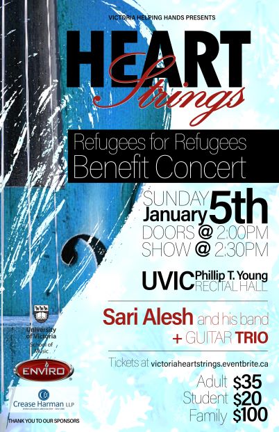 Sari Alesh and his band + Guitar Trio are Syrian refugees recently settled in Victoria BC will offer an afternoon of music to support newly sponsored single mom family of six. The proceeds from the concert will support both the family and the musicians.