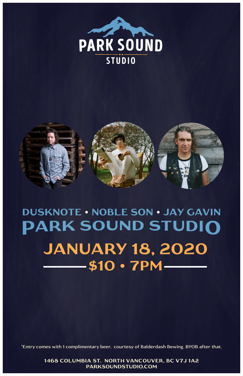 Park Sound Presents is a monthly musical showcase hosted at Park Sound Studio, a recording studio located in North Vancouver, BC. On Saturday, January 18th, we're welcoming Noble Son, Dusknote, & Jay Gavin and The Tired Sunday Choir.