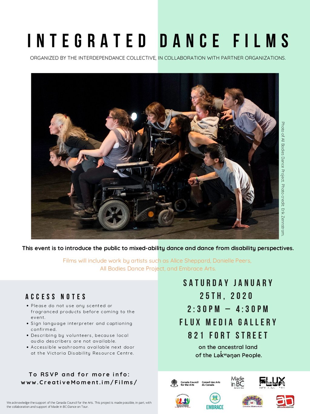 Films will include work by artists such as Alice Sheppard, Danielle Peers, All Bodies Dance Project, and Embrace Arts.