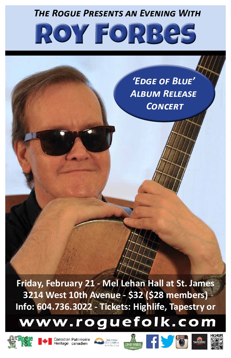 Roy Forbes is one of Canada’s best known and best loved songwriters and performing artists. A new Roy Forbes recording is a rare occurrence. He takes his time, working slowly to get it right. Edge of Blue may just be the Vancouver singer-songwriter’s best yet- a summation by an artist who has been doing this for a long time. On this album both Roy’s roots and routes are showing; the influences he’s absorbed and where he’s been. Edge of Blue is 10 songs full of wisdom, confessions, vulnerability, sensuality, self- reflection and celebration. More of a soul album than country or folk; it has nothing to do with what is ‘hip’ and ‘happening’ in the mainstream music business.