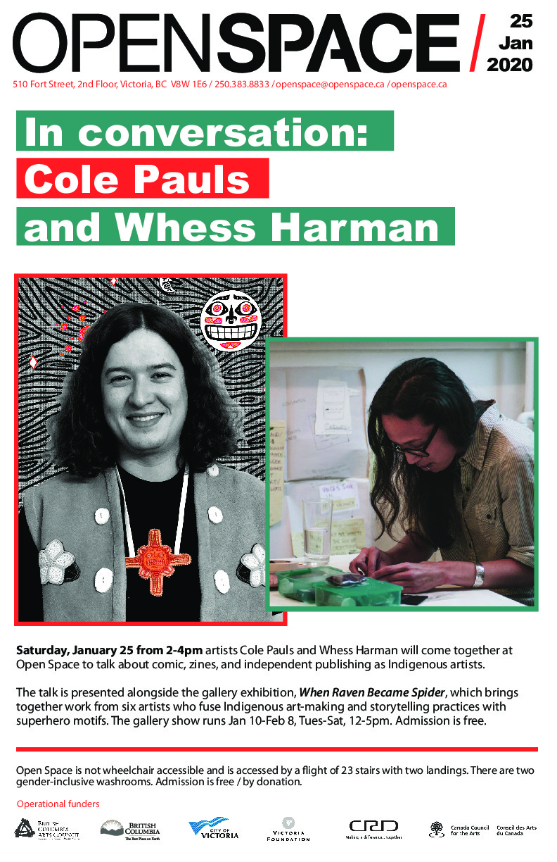 Saturday, January 25 from 2-4pm artists Cole Pauls and Whess Harman come to Open Space to speak about comics, zines, and independent publishing as Indigenous artists.