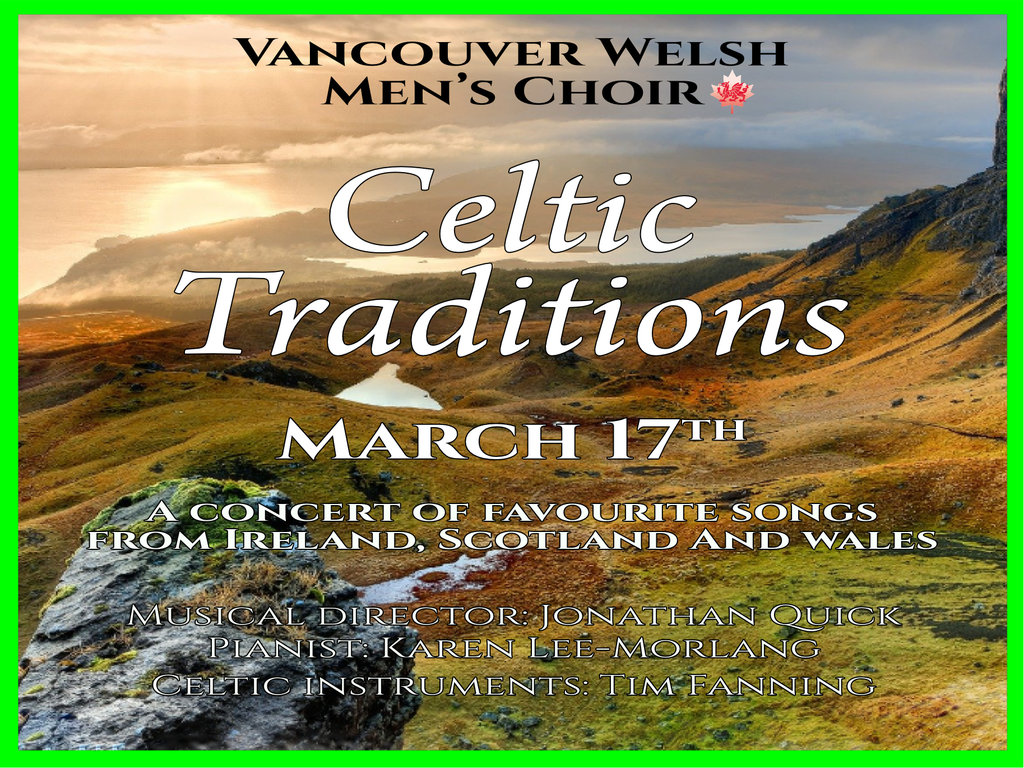 Under the direction of Music Director Jonathan Quick, with piano accompanist Karen Lee-Morlang, and guest piper Tim Fanning on the majestic Scottish bagpipes and the haunting Uilleann pipes, the choir will perform traditional Celtic favourites including the Welsh Hymn Gwahoddiad (in Welsh), Loch Lomond, Fields of Athenry, My Heart’s in the Highlands, Down by the Salley Gardens, The Wild Rover, Molly Malone, and many more.