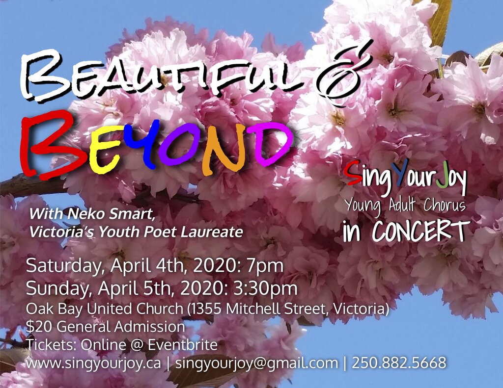 Beautiful & Beyond v2.0 - SingYourJoy in Concert: SingYourJoy Young Adult Chorus, Neko Smart  (guest artist) @ Oak Bay United Church Apr 5 2020 - Jan 14th @ Oak Bay United Church
