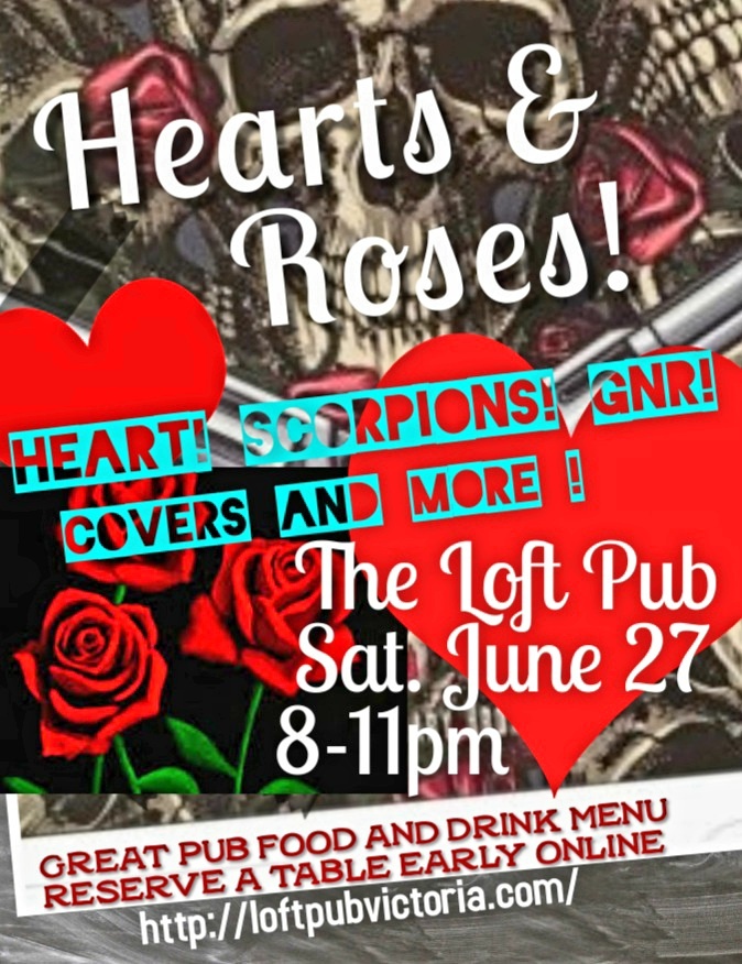The Hearts and Roses band will be performing at the Loft Pub on June 27, 2020 from 8 pm to 11 pm. Please come out and support live entertainment. Class Rock music will include Heart, Scorpions, GnR and More....Purchase your $10 ticket on-line and make sure you reserve a seat and have a rockin good time!