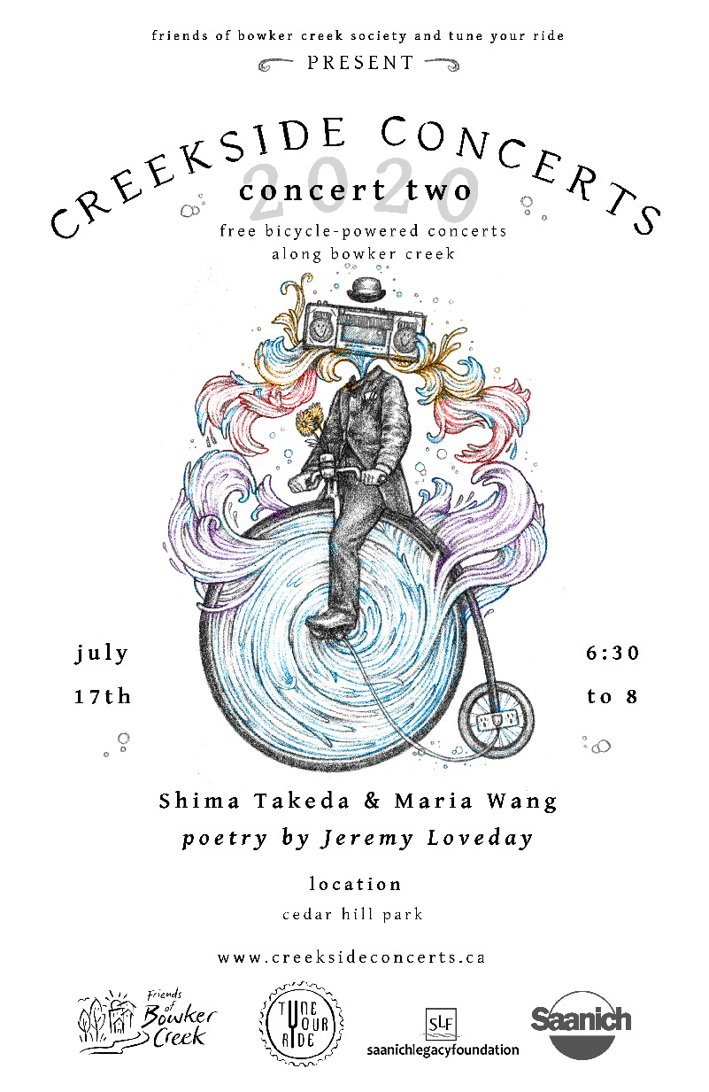 The second concert in our second season of free bicycle-powered concerts along Bowker Creek features a Lekwungen welcome by TEALIYE/Brianna Bear, poetry by Jeremy Loveday and music by Shima Takeda (violin) and Maria Wang (cello) of the Breakwater String Quartet. http://www.creeksideconcerts.ca