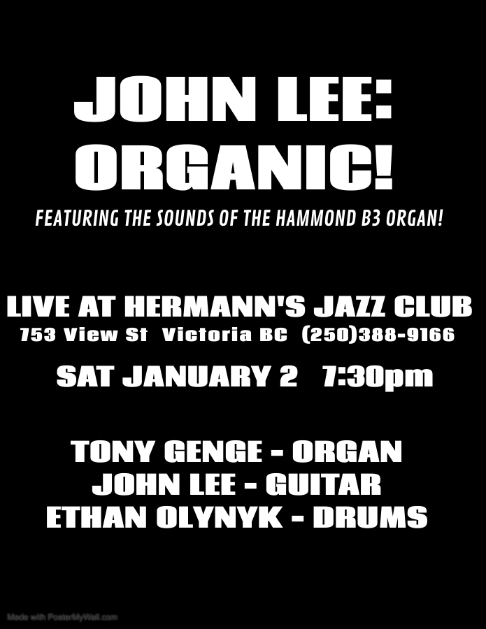 John Lee leads a trio on guitar featuring Tony Genge on the Hammond B3 Organ. A night sure to be filled with the blues, standards and more!