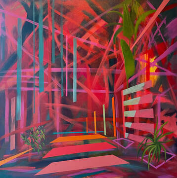 In this new series, Ira Hoffecker introduces organic shapes into her geometric compositions. The twenty paintings still use geometric shapes and architectural mapping to create depth. “But they no longer refer to a specific place,” she says. “They now show elements of urban architecture in a landscape setting.”
