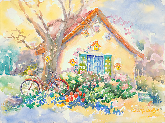 “Painting is an expression of my perennial love affair with life and the beauty around me. As I gaze out of my 1863 log house studio, down to the Cowichan River and Bay where I swim all summer or up to Mt Tzouhalem, to a sacred peak where I hike every day, I am in awe of the rich spectrum of compositions that unfold. I like fresh air and old linens, architecture and antiques and whether painting an old milk jug filled with sweet peas, a riotous country garden, Victorian house or bowl of sun-warmed peaches, I’m looking to express a wider experience, a vivid harmony, a balance of energy, form and beauty.”