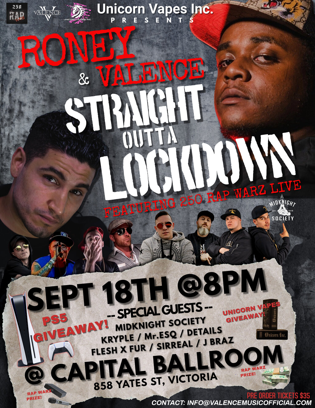 Straight Outta Lockdown with Roney & Valence featuring the very first 250 Rap Wars live battle and an impressive lineup of performers including Kryple, Mr. ESQ, Details, and FleshXFur! An epic night of nonstop entertainment brought to you by Unicorn Vapes Inc. & Valence Music.
