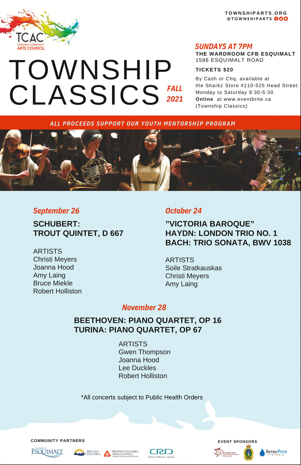 Township Classics is back and playing concerts again at the Wardroom! Please come and enjoy a stellar performance of Schubert’s very well known “Trout” Quintet, Sunday, September 26th at 7pm with Christi, Joanna, Amy, Bruce and Rob.