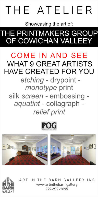 New this month in THE ATELIER: 10 Printmakers of Cowichan Valley showcasing etching - dry point - monotype print silk screen - embossing - aquatint - collagraph - relief print. Beautiful quality and unique art well priced for your Christmas Shopping. Also, in THE GALLERY we have 7 well known local artists displaying quality paintings, pottery, jewelry, photography and wood sculptures. Over 200 art items that create beautiful spaces, and objects triggering an emotion and lift the spirit converted horse barn. We are open Thursday to Sunday 10am to 4pm.