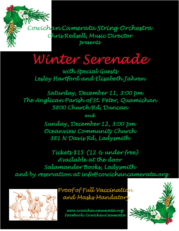 Under the musical direction of Chris Redsell, the Camerata’s ‘Winter Serenade’ concert will be held December 11 at St. Peter’s Church (Quamichan) in Duncan. The program is diverse and includes pieces by Frederick Delius, Fritz Kreisler, J.S. Bach, Samuel Barber, and Elgar’s Serenade for Strings. Guest harpist Lesley Hartford will join the orchestra for Vaughn William’s beautiful “Fantasia on Greensleeves”. Chris, our musical director (and professional violist) will join special guest Elisabeth Jahren to play her arrangement of Bartok’s Romanian Dances on accordion. To round out the program, the Camerata will also perform some instrumental Christmas carols.