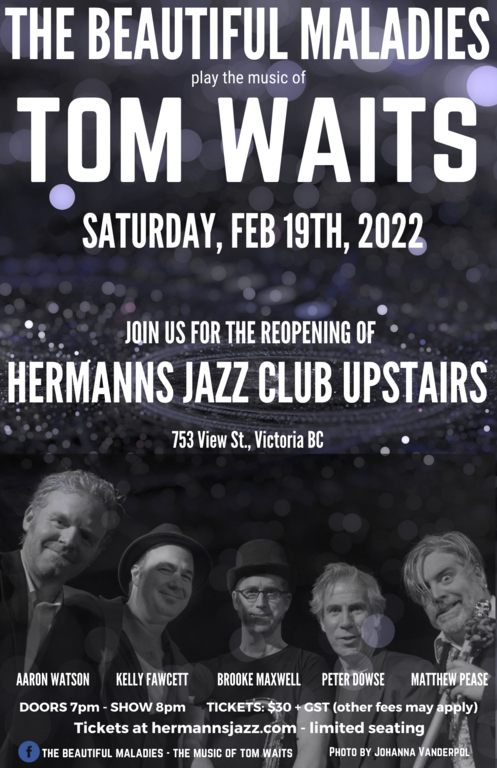 Based out of Victoria, BC, The Beautiful Maladies have been bringing the music of Tom Waits to live audiences since 2015. With continual sold-out shows at Hermann’s Jazz Club, the band is now touring Vancouver Island, with eyes on the mainland.