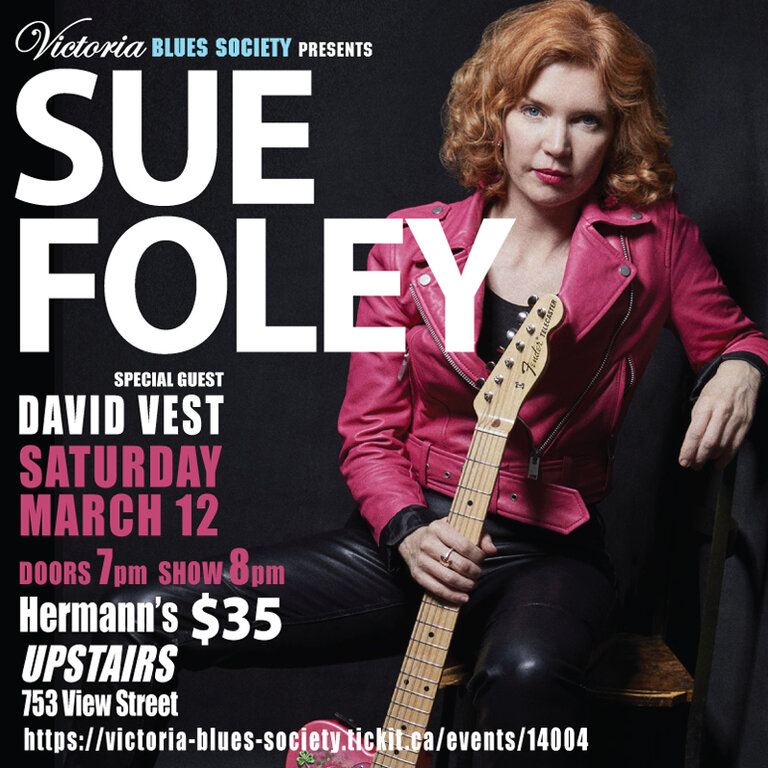 This a show not to be missed! Victoria Blues Society presents 2019 Juno Nominee, 6 Time 2019 Maple Blues Nominee, 2020 Blues Music Award Winner Sue Foley with special opening guest David Vest. Hermann's Upstairs 751 View Street.