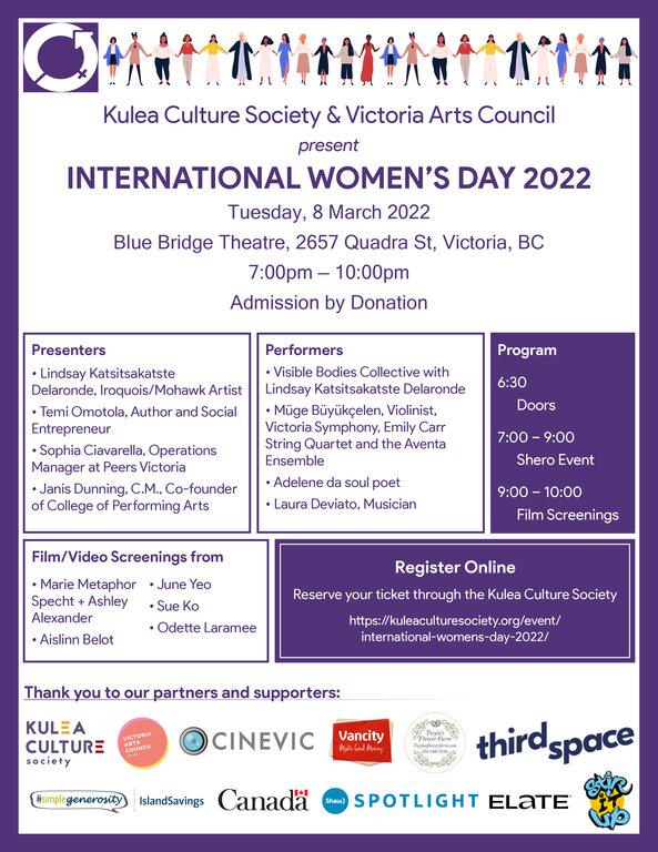 This year Kulea Culture Society cooperates with Victoria Arts Council to celebrate IWD in Blue Ridge Theatre. The event starts with a celebration of trailblazing women from our diverse communities. Each woman answers the question “Who is your Shero?” in their own way. These passionate women, from all walks of life, present their Sheros who motivate them with their work in the community. Inspiring artists and performers will contribute to this celebration with their art. The event will continue with the screening of short films by talented women.