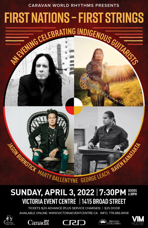 aravan World Rhythms is overjoyed to once again present live music in front of live audiences after another winter Covid hiatus. We launch our return in Victoria with an all-star showcase of Indigenous guitarists/vocalists from diverse First Nations communities, featuring award-winning musicians and songwriters, Jason Burnstick (Cree), George Leach (Stl’atl’imx), Raven Kanatakta (Anishinaabe/Mohawk), and Marty Ballentyne (Cree). They will be joined by local Vancouver musicians, Johnny Walsh on bass, and Michael Simpsonelli on drums.