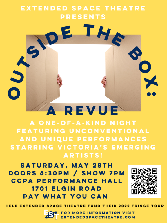Extended Space Theatre presents “Outside the Box: A Revue.” Grab your gals and pals and get ready for a night of entertaining, unpredictable, and absurd performances. Join us as we celebrate the weird and wacky things that make us unique through song, dance, comedy, and more. Featuring a diverse group of Victoria’s emerging artists, from theatre artists, dancers, and drag performers, to poets and comedians. All proceeds will go to Extended Space Theatre’s summer 2022 fringe tour.
