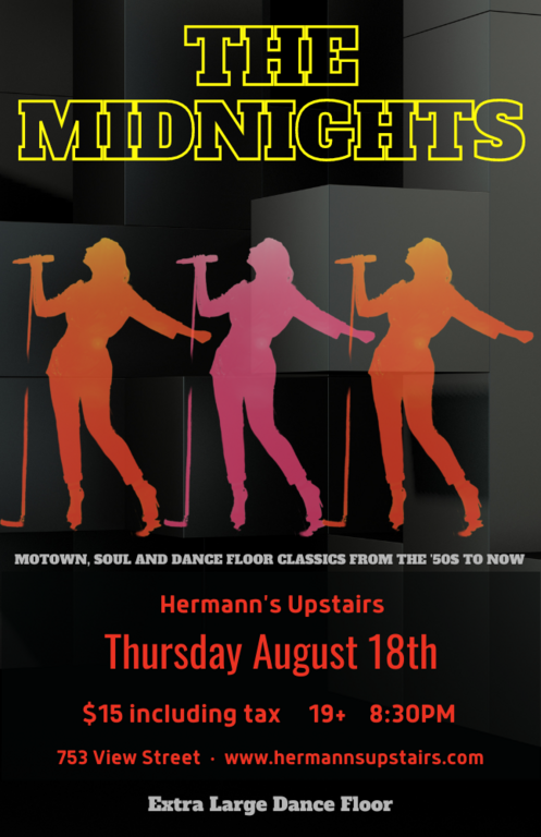 The Midnights are a dynamic 12 piece choreographed band with an energizing rhythm section, sizzling horn section, and fronted by 5 exquisite male and female vocalists. Covering decades of music from the '50s to the present, the high energy Midnights provide just the right combination of style and substance to bring any party to life.