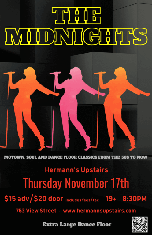 The Midnights are a dynamic 12 piece choreographed band with an energizing rhythm section, sizzling horn section, and fronted by 5 exquisite male and female vocalists. Covering decades of music from the '50s to the present, the high energy Midnights provide just the right combination of style and substance to bring any party to life.