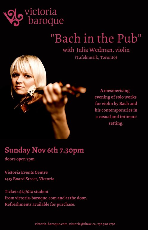 Come enjoy some of the most exhilarating solo writing for the violin and meet our special guest artist, the acclaimed Canadian baroque violinist Julia Wedman, in the casual, intimate setting of the Victoria Events Centre. A range of refreshments can be purchased at the event.