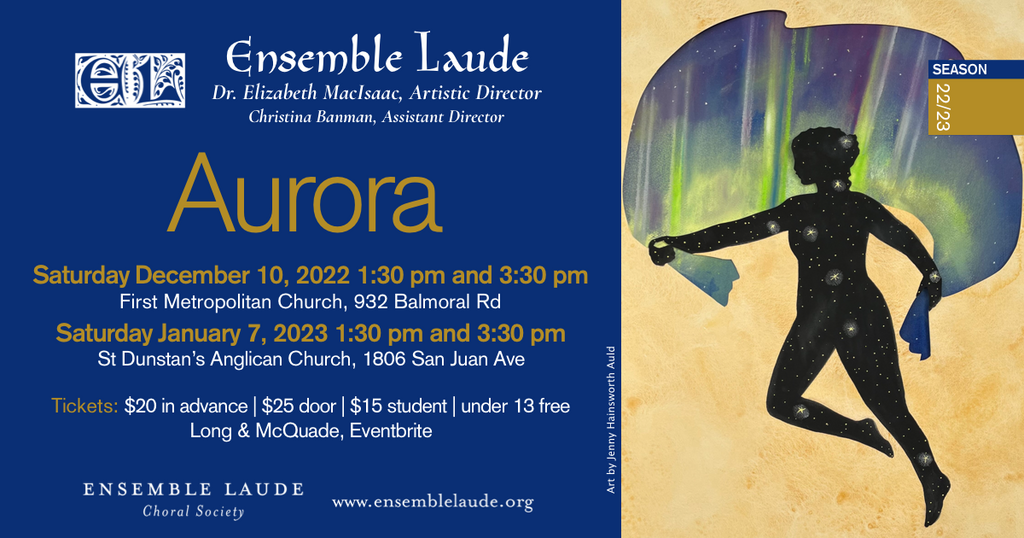 Aurora will include several mystical works of Hildegard von Bingen, Winter Sun by Don MacDonald, Jam! by Tracy Wong, Aurora by Victoria composer Nicholas Fairbank, and Lunar Lullaby by Jacob Navarud.