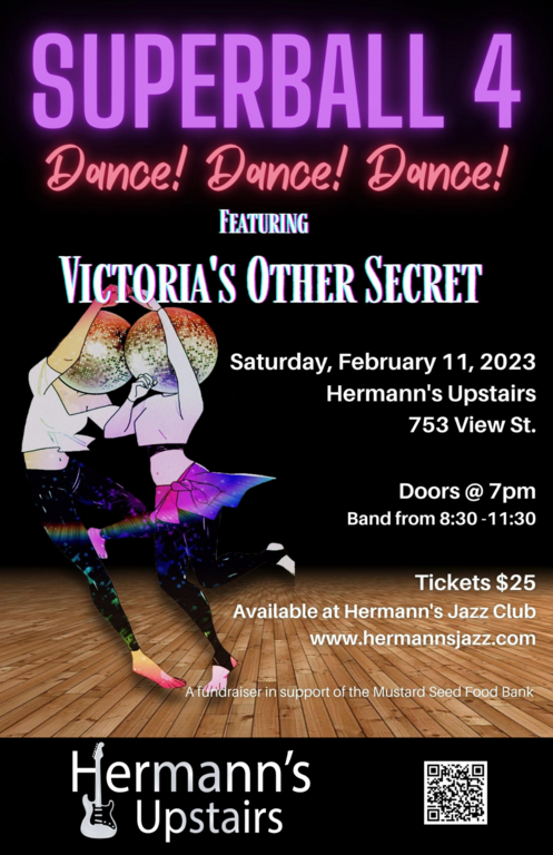 Victoria’s Other Secret is a bedazzling band of educators, gathered together because of the magic of music. Our raison d’etre is to move your feet, make you smile and warm your hearts. Our musical repertoire ranges from hip hop, R&B, funk, rock, country, and even some Beatles. It’ll be a great time for a great cause: this year’s cause is the Mustard Seed Food Bank and Victoria’s Other Secret will happily make a donation on your behalf. See you on Saturday, February 11!