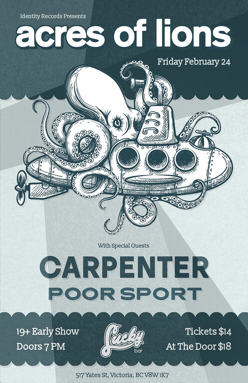 Victoria pop-rockers Acres Of Lions headline their first show in nearly a decade at Lucky Bar with Vancouver Farm Core legends Carpenter and local Emo post-hardcore punks Poor Sport.