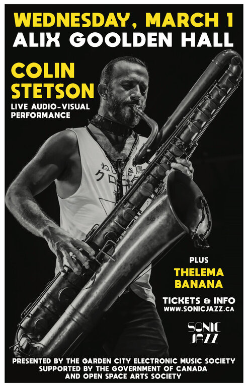 Supporting artist Thelema Banana is an avante-garde electronic and electro-acoustic project featuring Aaron Watson (bass clarinet, musical saw, accordion, shakuhachi), Jzero Schuurman (percussion), and David Bodrug (electronics). Thelema Banana’s sound design is guided by philosophical and historical themes, creating visceral audio environments of lost or future eras, self-characterized as dark jazz, post-industrial ambient and xenophrenic soul.