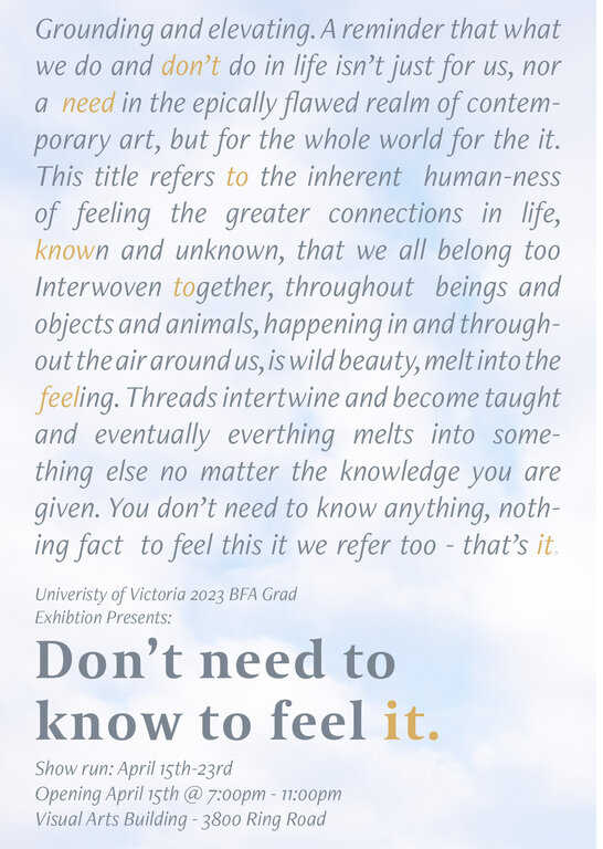 The University of Victoria’s Visual Arts graduating class will be showcasing their work in a final year exhibition titled Don’t Need to Know to Feel It, from April 15th-23rd. There will be an opening celebration held on April 15th in the Visual Arts Building on campus. The exhibition will highlight the work of 23 emerging artists created over the course of the year. The collection will include sculpture, performance, installation, painting, drawing, digital media, and animation.