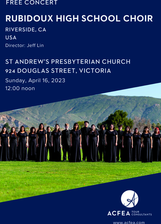 A high school choir visiting from Riverside, California, offers a short program of a cappella selections, including Gjeilo's haunting Ubi Caritas and Paulus's The Road Home. Come support Rubidoux High School on its first international tour! Admission is free.