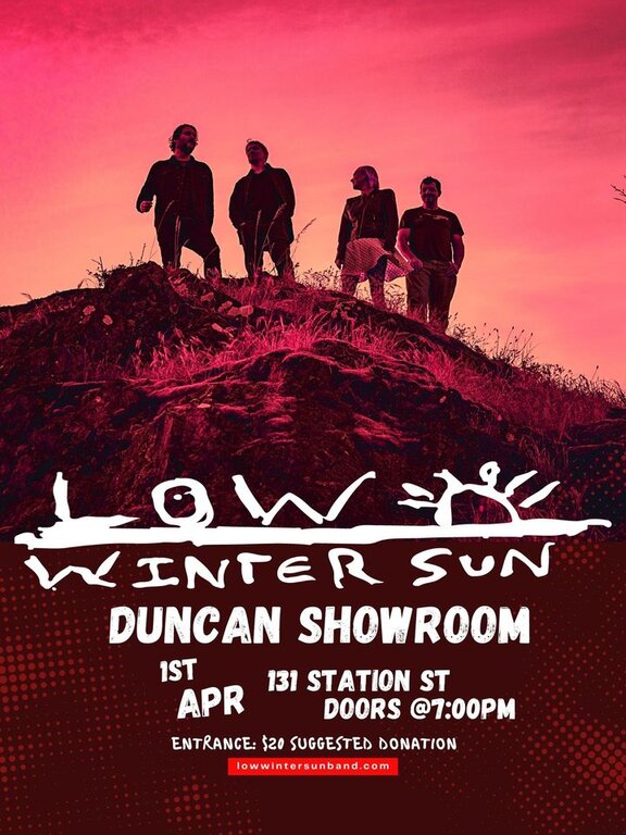 Victoria based band with a cello, Low Winter Sun, rocks the Duncan Show room Saturday April 1st as they tour to promote their newly released album. Described as "Beautifully Loud," they love harmony and melody but also love to make some noise. It'll be an energetic night for those who love guitar rock... but with the cello twist.