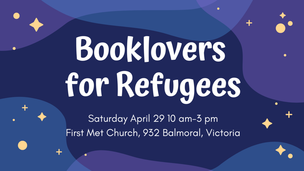 Hundreds of books for sale- a carefully curated booklovers' selection of fiction and non-fiction titles including many recent award winners and nominees, all in new, near-new or excellent condition. Grab a coffee, tea or snack, chat with our volunteers about refugee sponsorship, and meet some local authors too! All proceeds go to support two refugees- one from Afghanistan and one from Uganda, both waiting for resettlement to Victoria.