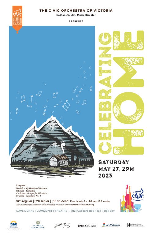 The Civic Orchestra of Victoria presents Celebrating Home - a concert which offers a selection of works written by composers about their own countries. Together we will take a journey viewing the homelands of Sibelius, Dvořák, Coulthard, and Brahms through their own musical interpretations. In Prayer for Elizabeth by Jean Coulthard one may even find a nod to Canada and our own history. The Civic Orchestra is delighted to take you on this international music journey at the Dave Dunnet Community Theatre in Oak Bay on May 27th.