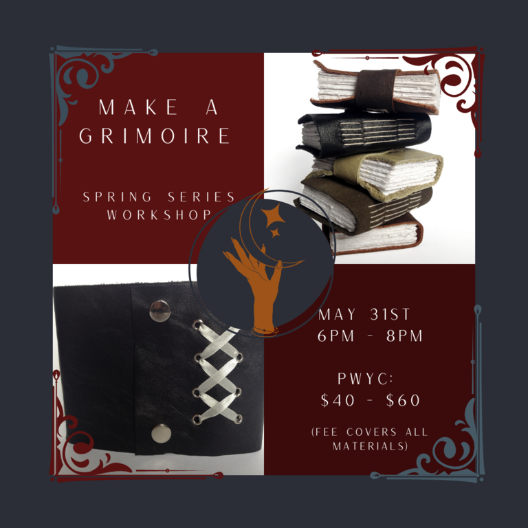 In this workshop, you will get to make your own leather bound grimoire with added decorative details while learning and chatting about all things grimoire related! The workshop is being facilitated by the amazing artist Laura Rechwan.