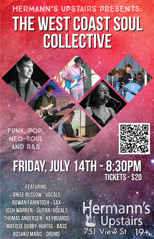 The West Coast Soul Collective is an exciting and dynamic group of Victoria’s best young musicians, playing high energy Funk, Soul, Rock, Pop, and more! Led by Victoria-born & Toronto-based multi-instrumentalist Josh Warren, this group is made up of members studying music across North America at institutions such as Berklee College, McGill University, Humber College, and more. From events such as Lights of Wonder and the TD Jazzfest, to venues such as Hermann’s Upstairs and the Victoria Event Centre, you’ll hear this group funking up the island in spectacular fashion every time they come together. Fronted by fantastic local talent Anise Russow on vocals, you’ll hear music from the 60s all the way to today - hits, deep cuts, original arrangements, and everything in between!