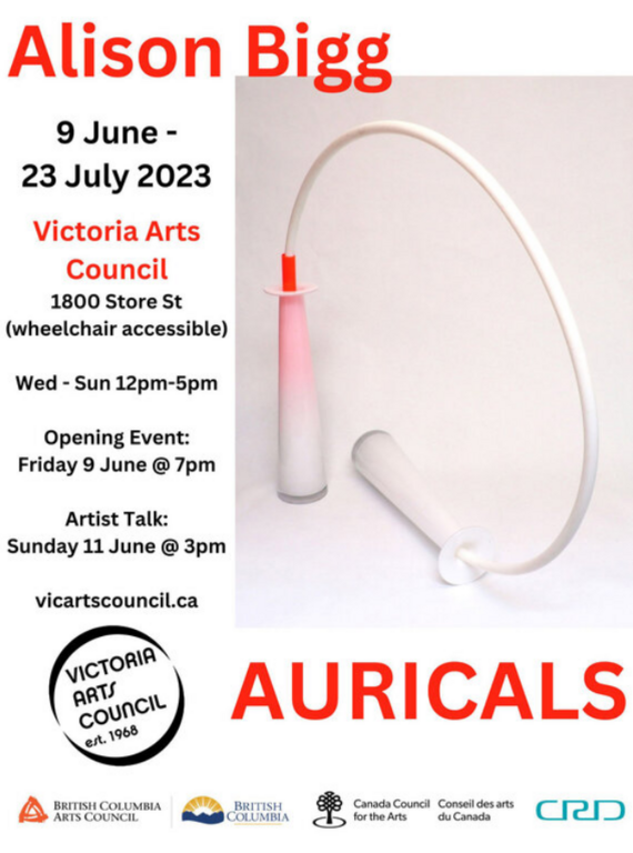 Victoria Arts Council is excited to present this solo exhibition by local artist Alison Bigg working in sculpture, installation, and printmaking. In her latest work, Bigg assembles aurical devices using found objects and 3-D printing to help the viewers experience their senses more fully. In her printmaking work, Bigg speaks about language and communication using multiple layers and techniques. She questions the difference between hearing and listening, how we listen but don’t always hear, a result of an overload of information in the digital age.