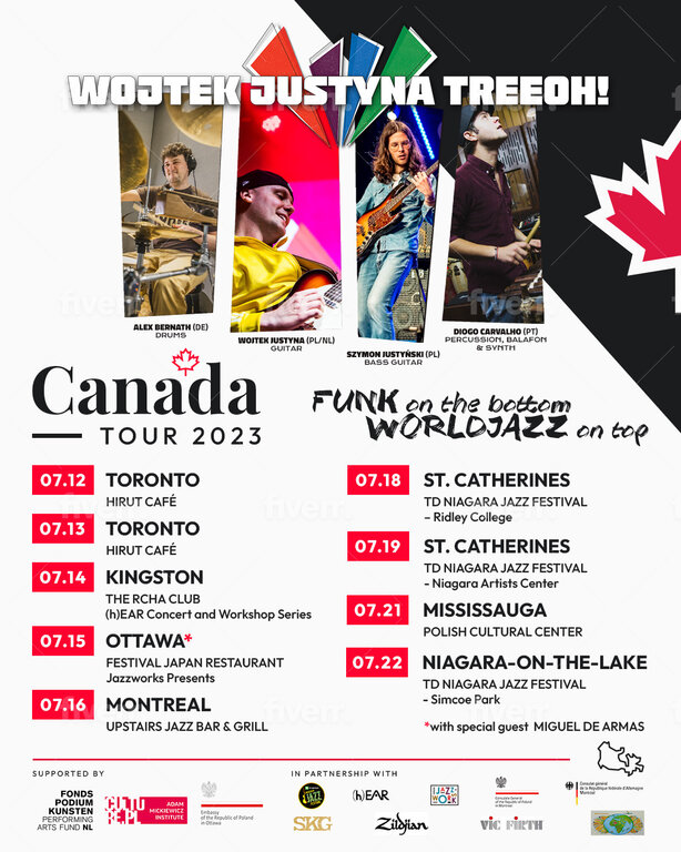 The Wojtek Justyna TreeOh! fuses the energy of funk-jazz, the colors and rhythms of world music with fresh sonic explorations. Formed in Holland by Polish guitar player Wojtek Justyna who is recognized for his sound and versatility, the band consists of members from different parts of Europe: from Austria, bassist Daniel Lottersberger whose heavy groove is supported by a true festival of rhythm courtesy of funk drummer extraordinaire Alex Bernath, from Germany, and Portuguese percussion wizard Diogo Carvalho who also commands the Moog synthesizer. This gives Wojtek a thick, rich base for his singing, melodic guitar phrases to float on top of.