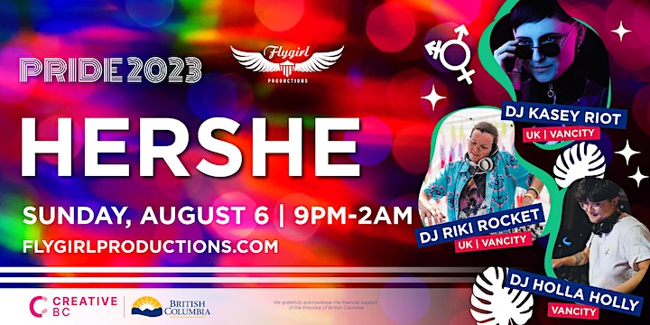 The whole wonderful weekend leads to Hershe Bar, Flygirl's famous and full-on Pride party held on Sun Aug 6, 2023, 9pm-2am at The Red Room 398 Richards Street, Vancouver. This one-night festival is a supersonic tonic of pumping sound, stunning performers, CO2 jets, and dynamite DJs.