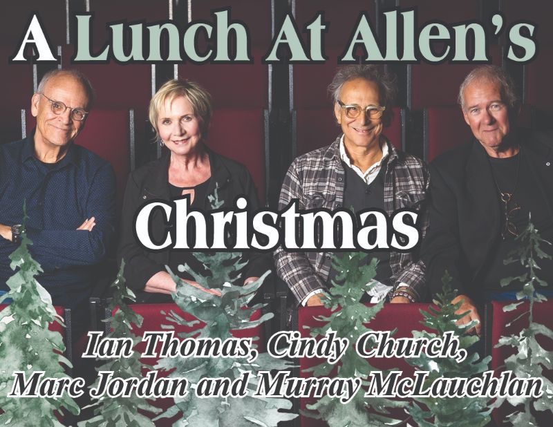 Lunch At Allen’s is a musical powerhouse comprising four internationally renowned Canadian talents: Murray McLauchlan, Cindy Church, Marc Jordan and Ian Thomas. While songs like Murray’s Farmer’s Song, Marc’s Marina Del Rey and Ian’s Painted Ladies form our collective life soundtrack, as individuals, these artists have also penned hits for Bon Jovi, Josh Groban, Chicago, Bonnie Raitt, America, Santana, Cher, Diana Ross and Rod Stewart. The icing on the Lunch At Allen’s cake, however, is the expressive, poetic voice of Cindy Church (Quartette, Great Western Orchestra) … together their familiarity and camaraderie, their exquisite harmonies and sheer volume of combined musical talent adds up to a delectable evening’s entertainment.