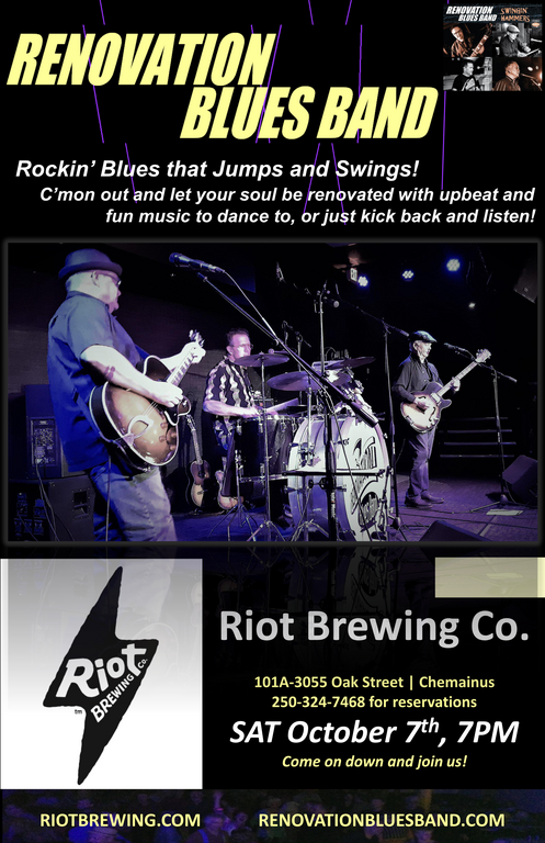 The return of the Renovation Blues Band to Riot promises to be a soulful and energetic experience. Rock'n Blue music has a way of getting people on their feet and grooving to the rhythm. Whether you're a passionate dancer or prefer to enjoy the music from the comfort of your seat, There will be something for everyone to enjoy. Call to make reservations 250 324 7468