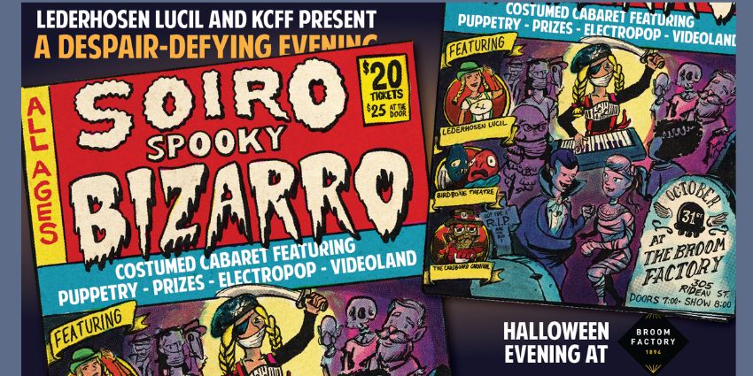 The spooky season is upon us! Join us at the Broom for a despair-defying evening of cabaret, puppetry, electropop, and prizes. Featuring performances by Birdbone Theatre, Von Boltz, and the one and only Lederhosen Lucil!