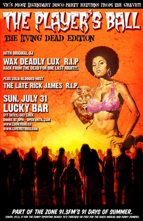 Hosted by the Late Rick James. Part of the ZONE 91.3fm's 91 Days of Summer. Cover: $7, $5 for the funky (sporting deadly 70's threads), or free for the Disco Undead and Funky Zombies.