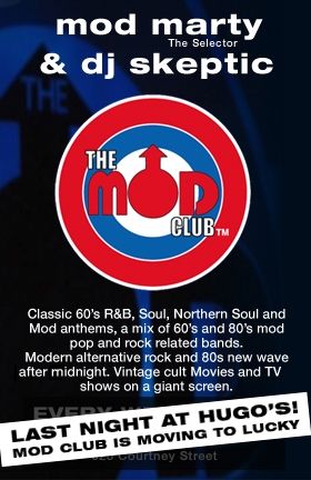 THIS IS OUR LAST NIGHT AT HUGO'S!! Next week The Mod Club moves to Lucky Bar ...