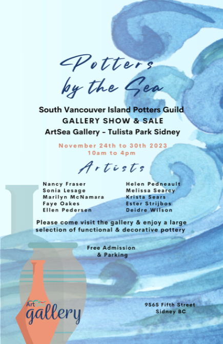 From functional to decorative, the Potters Guild will again be presenting work at ArtSea Gallery in Tulista Park Sidney. We look forward to seeing you during the show. All the details are included on the poster.